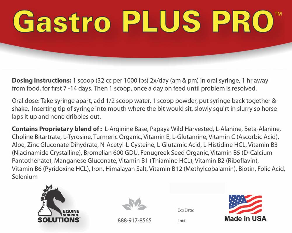 Gastro PLUS PRO™ address gastric and colonic ulcers from a different physiological standpoint than current drugs, which only suppress gastric acid for short term relief. Gastro PLUS PRO™ supplies condition specific nutrients and nitric oxide precursors to support the body's healing of damaged gastric tissue for long term relief and resolution, by increasing the horse's natural production of mucus which protects the lining of the stomach and intestines.