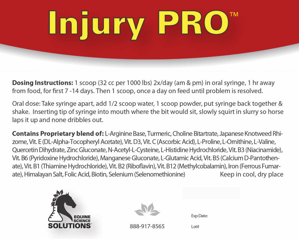 If you are like us, you hate that helpless feeling of... "What can I do right now to help my Horse"? Injury PRO allows you to turbo blast your horses healing power to trigger much faster healing. Injury Pro is designed to support the body's own healing process. Our state of the art precursor and nutrient delivery system triggers the body to increase blood flow to the injured area as well as production of collagen to speed tissue repair. Injury PRO triggers substantial healing quickly.
